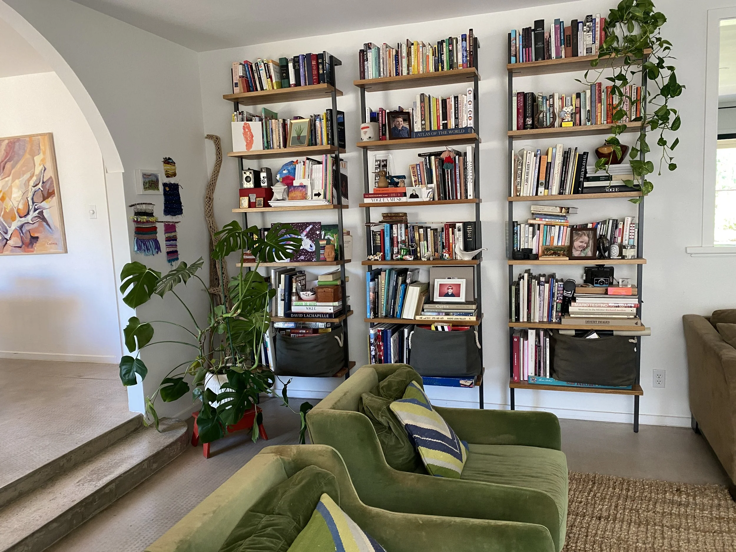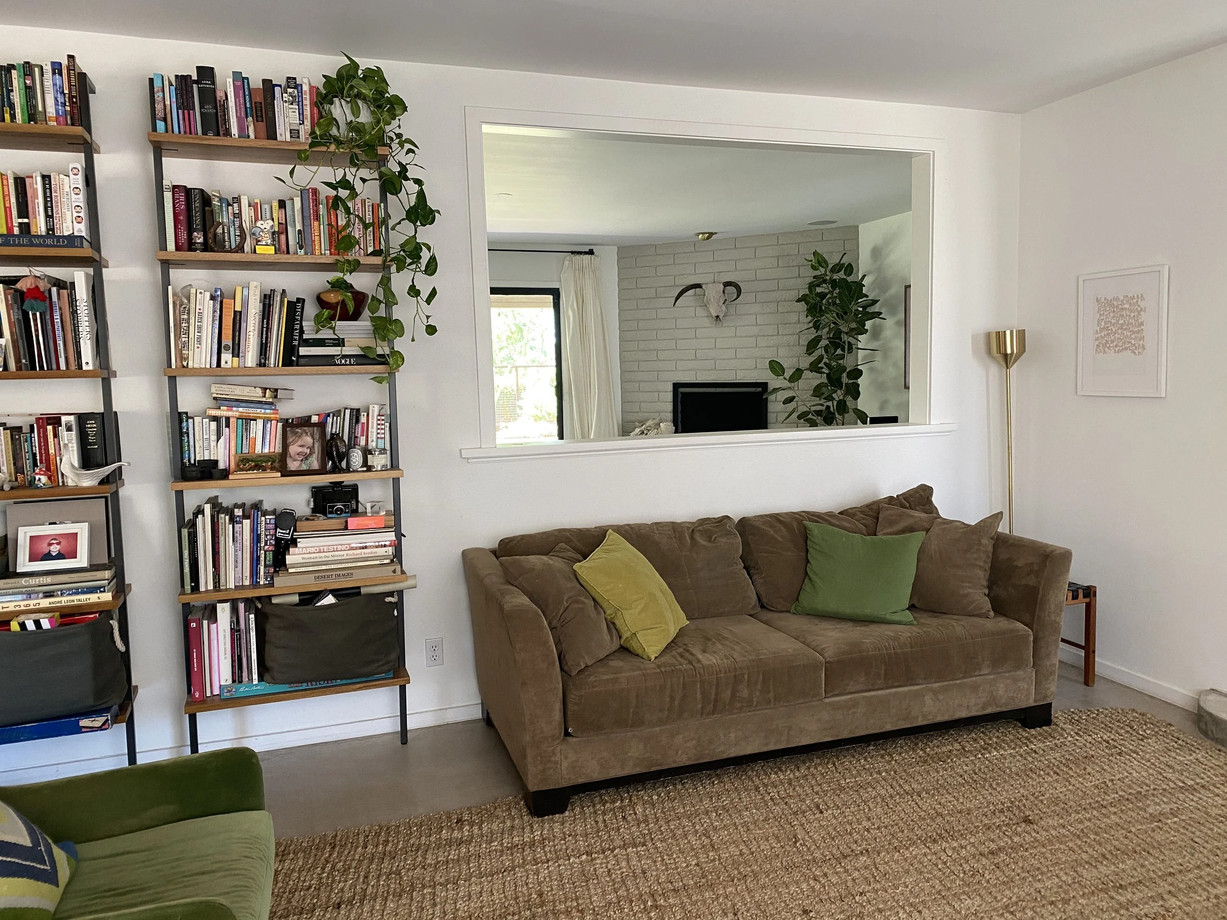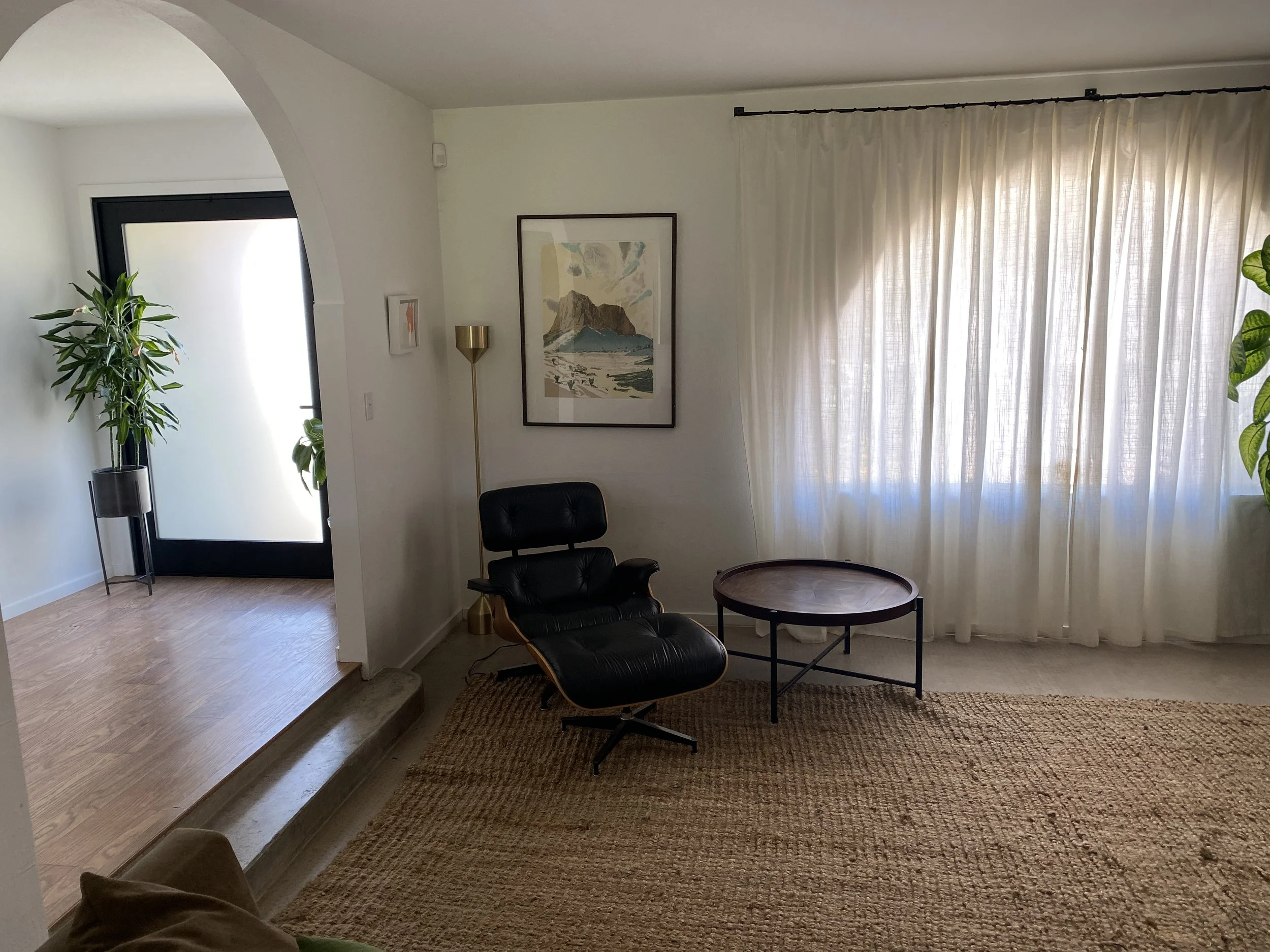 How to update layout of furniture to create a little conversation area that works with narrow space and awkward window placements